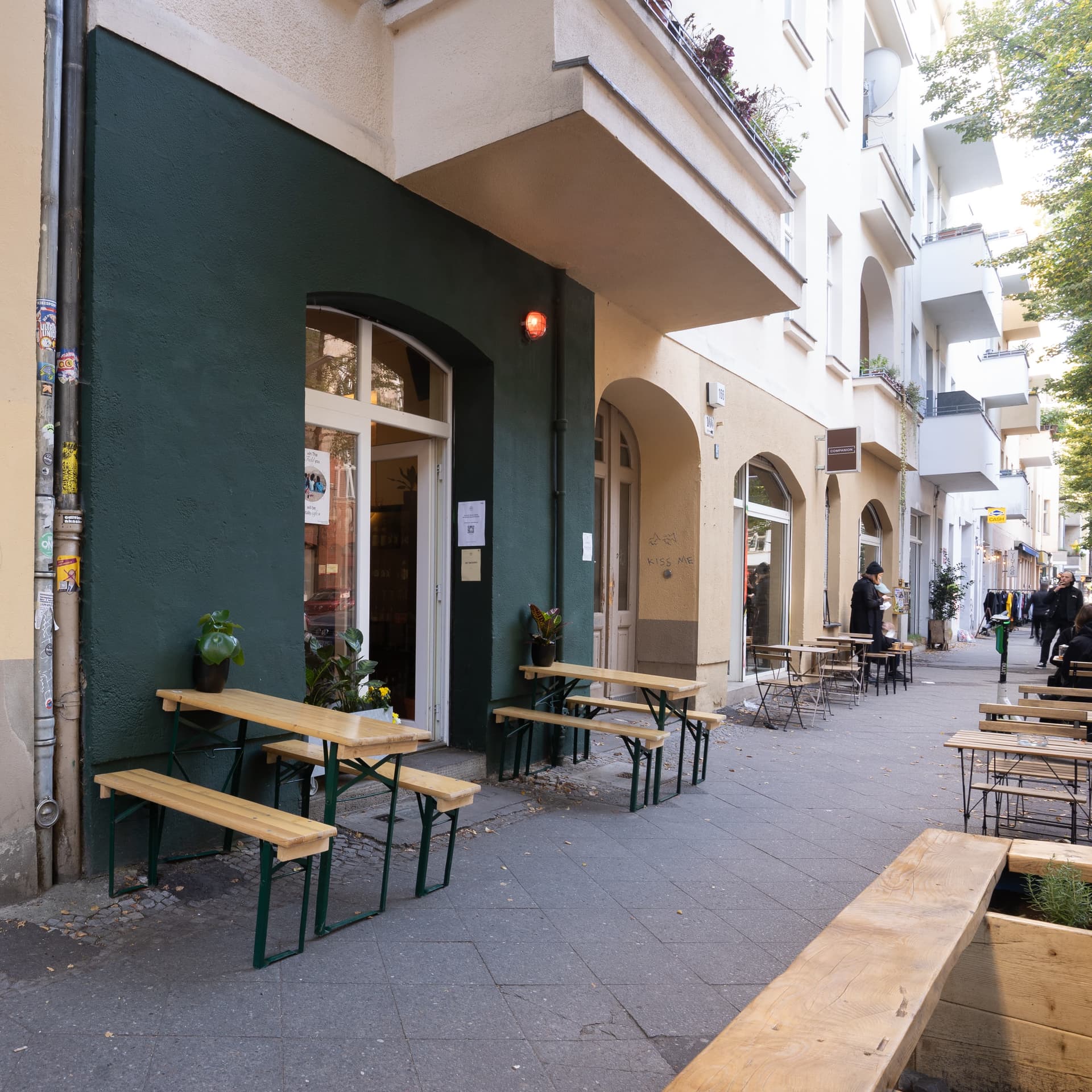 The space is situated at Weserstr. 166, 12045 Berlin, identifiable by its green exterior and bar-like appearance.