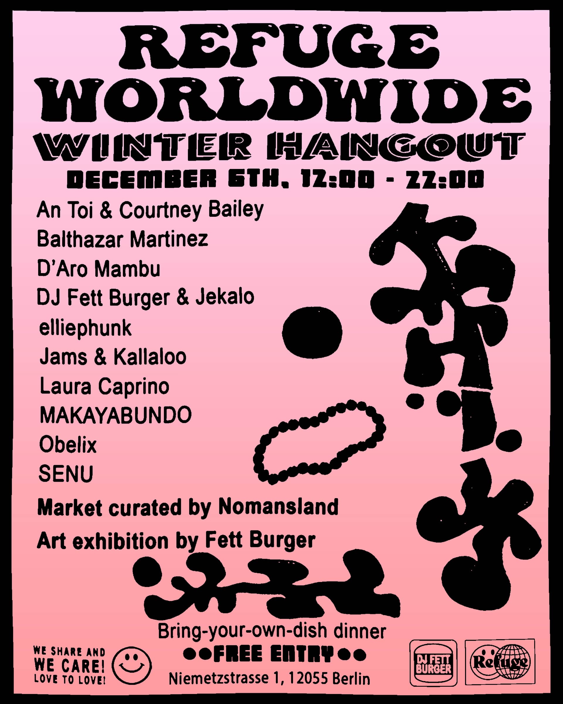 From 12 noon until 10PM on December 6th, we open the Niemetzstrasse doors for a Winter hangout with radio specials, Glühwein, an art exhibition by Fett Burger, a market curated by Nomansland and our second “bring-your-own-dish” dinner (food to be served from 6PM - sign up here if you want to bring a dish).