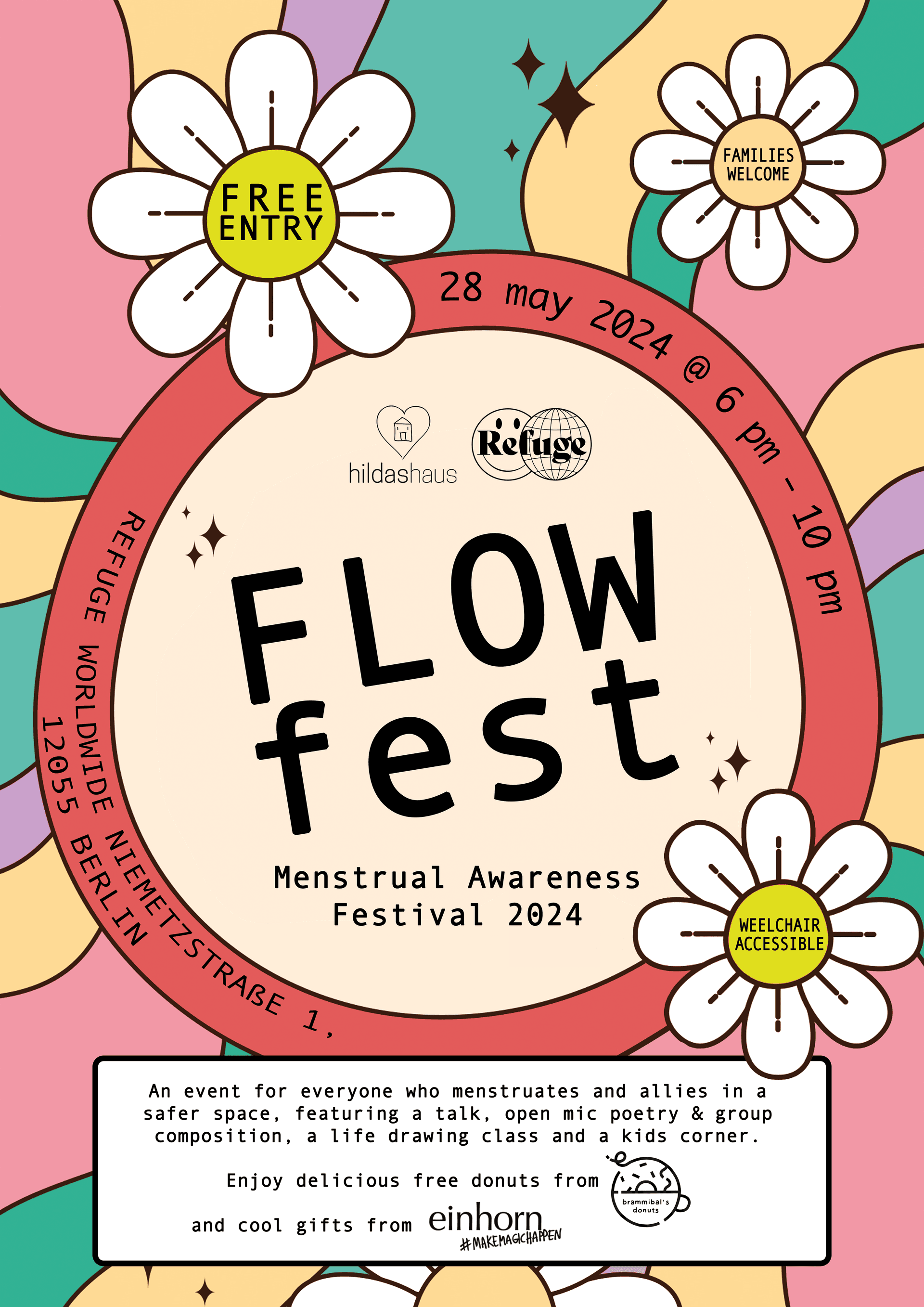 In collaboration with Hildashaus, a non-profit organisation with the mission of implementing "holistic, gender-sensitive solutions for displaced FLINTA* individuals aged 45+", we present FLOWfest. Taking place at our new location, Niemetzstrasse 1, on May 28th, FLOWfest presents a range of educational and artistic activities from 6 until 10PM.