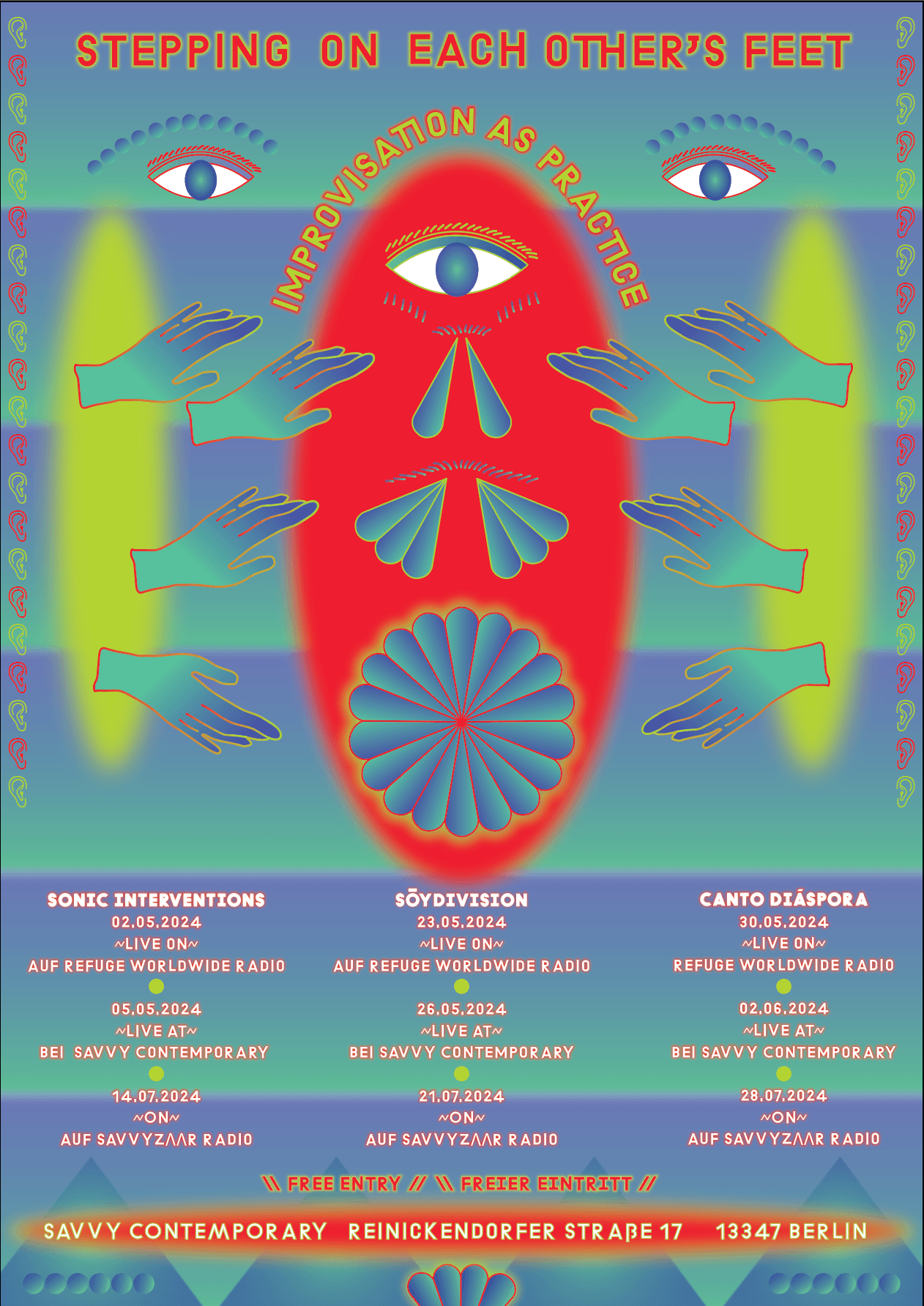 Performances and radio pieces on improvisation. Stepping On Each Other's Feet is a series of experimental sonic performances, grounded in improvisation as a method. It will bring together sound artists, musicians, DJs, and music producers based in Berlin to propose various formats of musical exchange, in order to emphasize the (pre)formal, quotidian, and social dimensions of creation as shared within sonic communities. The performances will take place at the SAVVY Contemporary in Wedding.